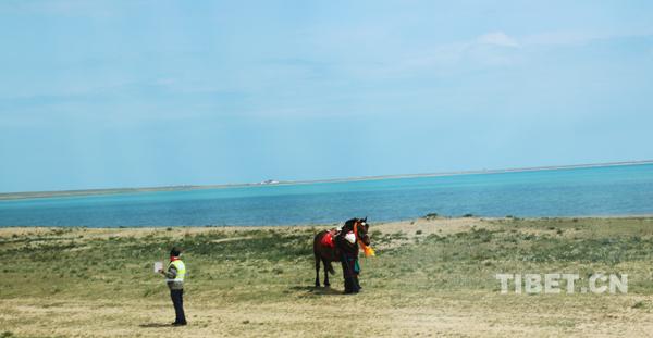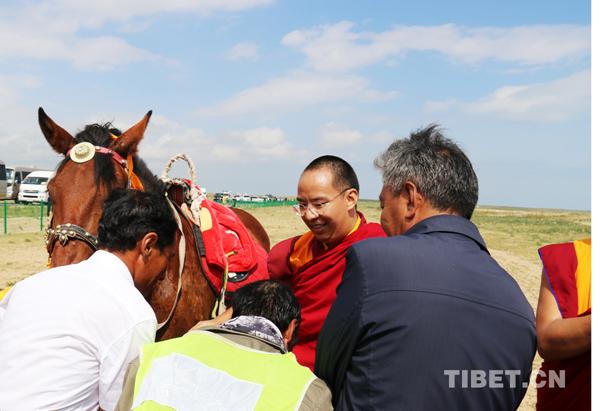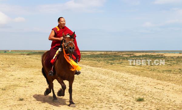 祭海儀式結(jié)束后,十一世班禪一行環(huán)湖游覽,在湖邊見到牧民斗改杰一家正牽著馬迎候。他們希望瞻禮到大師的尊容,為自己帶來福運(yùn)。十一世班禪一時興起,想要騎騎他們的馬。斗改杰一家平時在青海湖二郎劍景區(qū)經(jīng)營旅游騎馬項目,沒想到今天這樣幸運(yùn),十一世班禪騎著他們的馬,在青海湖邊七月鮮花盛開的草原上,瀟灑地馳騁了幾個來回。他們激動地都說不出話了。