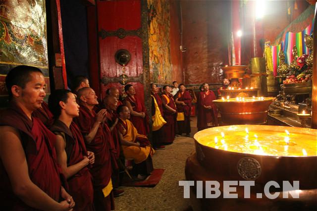 班禪還到扎什倫布寺大藏經(jīng)堂、漢佛堂、強(qiáng)巴佛殿等佛殿和經(jīng)堂,和各殿堂僧人一起念經(jīng)祈禱。每到一處佛殿,班禪與陪同高僧一道領(lǐng)誦經(jīng)文、拋灑青稞,祈愿五谷豐登、六畜興旺、國泰民安。攝影:王淑。