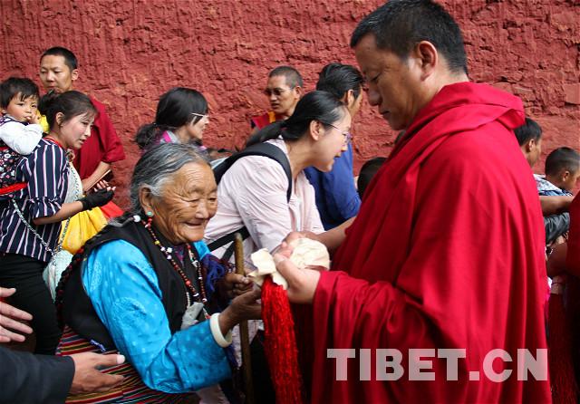 圖為接受班禪摸頂賜福后的嫫啦(老阿媽)領(lǐng)取金剛結(jié)。攝影:李元梅。