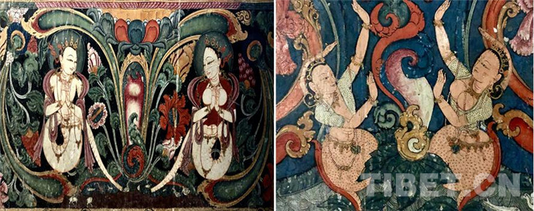 托林寺以龍女為代表的女性形象,留給我極深的印象,她們一方面?zhèn)鬟_(dá)的是宗教的光明和神圣,表現(xiàn)形式卻又是世俗的抒情性和誘惑性并存。端莊的面龐,優(yōu)雅的微笑,半裸的豐滿身軀扭轉(zhuǎn)出性感的曲線,置身于繪滿的花草圖案中,極盡優(yōu)美。當(dāng)我走進(jìn)這些畫作中,看著看著就迷失了,常常不知她們是人還是神,那空間是人間還是天國。(中國西藏網(wǎng) 文/圖 陳丹)