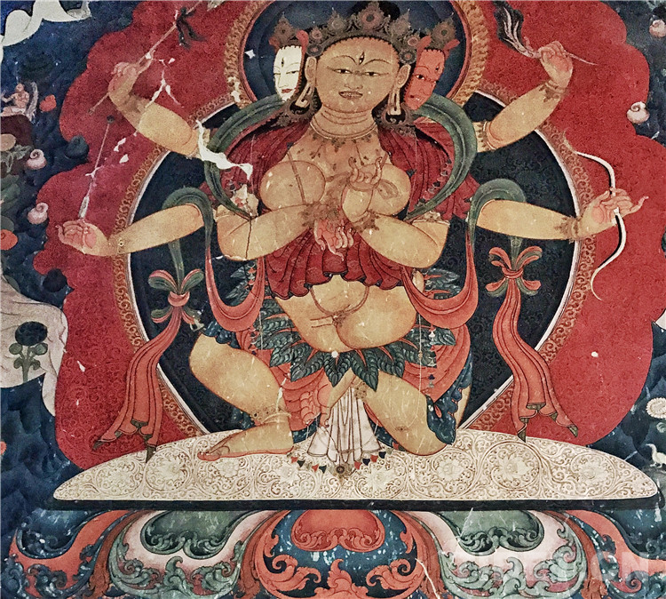 葉衣佛母的識別標(biāo)志是其身著以樹葉編織的衣裙,左上手持藥枝,其他五臂則持不同法器。葉衣佛母在藏傳佛教中是主管疾病醫(yī)藥的神。三頭六臂九眼,上身坦露,身軀呈現(xiàn)半蹲立姿態(tài),本件作品之風(fēng)格可以見到15世紀(jì)上半葉江孜風(fēng)格在古格繪畫的運用:包含以紅色,綠色,藍(lán)色為主的色調(diào);源于尼泊爾的淚滴狀頭冠形式;肩上飄逸的衣帶與衣著上的織繡圖案等。同時,背景中以暈染的深淺來呈現(xiàn)凌厲的巖石,以及呈卷狀拖曳的祥云圖飾,則是使用了漢地美學(xué)的元素。