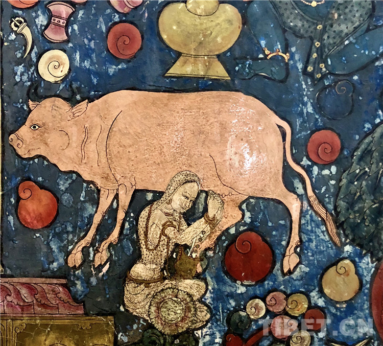 對于世俗生活的紀(jì)實性記錄,是古格時期壁畫的一大貢獻(xiàn)。生活場景、器物大量出現(xiàn)在托林寺壁畫中,圖中擠奶女子的神情很專注,牛也安靜得好似在享受。乳汁從女子兩肘之間流入她身前的罐子里。人和動物的比例都很精準(zhǔn),在大面積深色的背景上,畫家選用了淺色來描繪這個畫面,使得這微小的細(xì)節(jié)非常醒目。牧業(yè)一直是阿里地區(qū)的主要產(chǎn)業(yè),擠奶、制作奶制品是當(dāng)?shù)孛课徊刈鍕D女都會的家務(wù)。在自由創(chuàng)作的區(qū)域,壁畫創(chuàng)作者很自然地將這日常勞作描繪出來。但是,女子的服飾是印度風(fēng)格,牛也不是青藏高原特有的牦牛,說明了當(dāng)時古格藝術(shù)對外域文化的開放性。