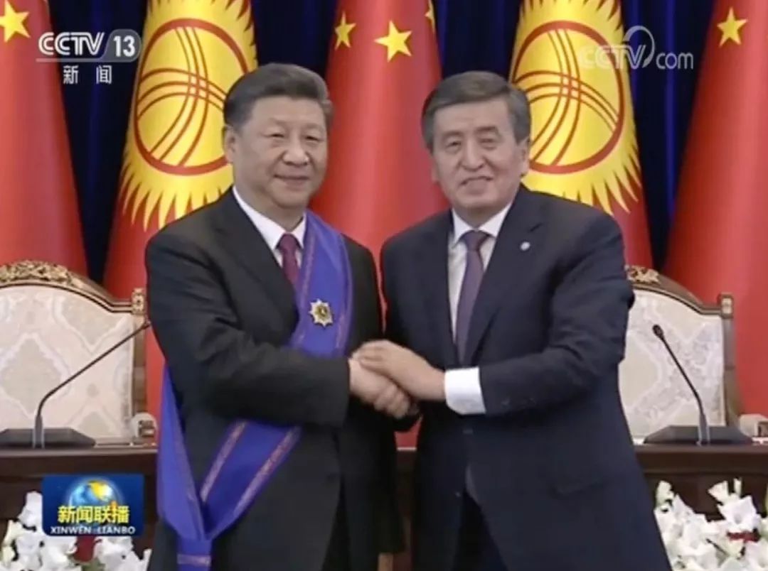 6月12日,習(xí)近平主席抵達(dá)吉爾吉斯斯坦首都比什凱克時,吉總統(tǒng)熱恩別科夫親自前往機(jī)場迎接,并舉行隆重歡迎儀式。期間,習(xí)近平被授予吉爾吉斯斯坦國家最高獎?wù)隆艾敿{斯”一級勛章。