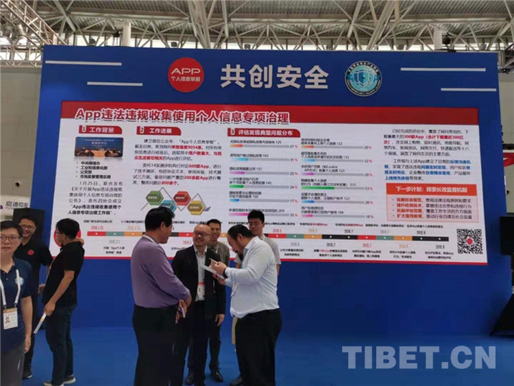 圖為2019年網(wǎng)絡安全博覽會上App個人信息保護展臺“共創(chuàng)安全”展板