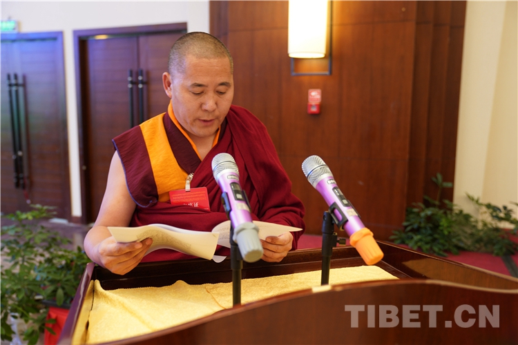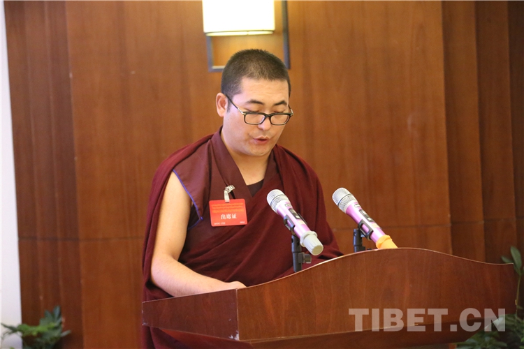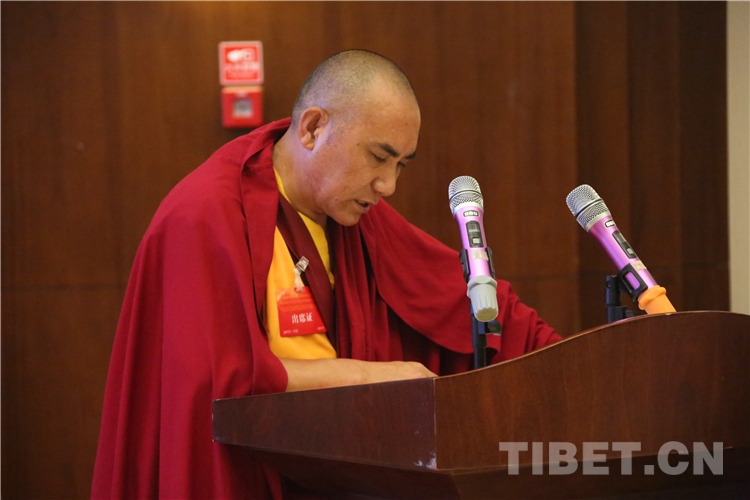 西藏自治區(qū)政協(xié)副主席、中國(guó)佛教協(xié)會(huì)西藏分會(huì)常務(wù)副會(huì)長(zhǎng)、西藏佛學(xué)院院長(zhǎng)珠康?土登克珠以“維護(hù)祖國(guó)統(tǒng)一和民族團(tuán)結(jié),堅(jiān)決反對(duì)分裂”為題,作教義闡釋演講。