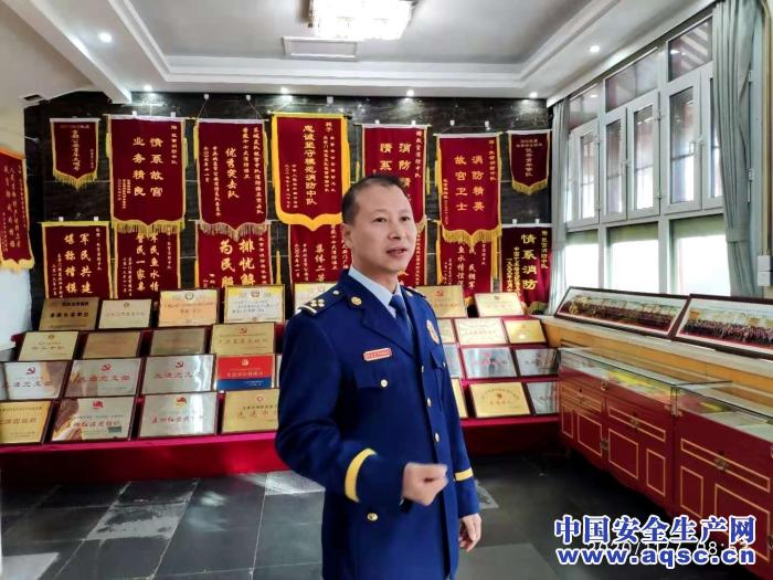 隊(duì)長(zhǎng)蔡瑞在榮譽(yù)室介紹“沒(méi)有戰(zhàn)功就是我們最大的戰(zhàn)功”。