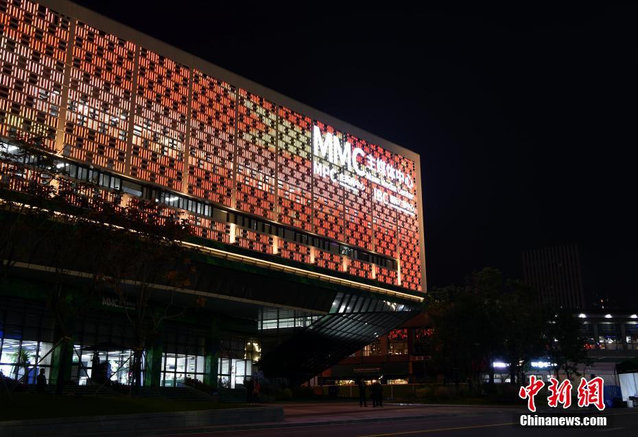 圖為夜色中的主媒體中心外景。 何蓬磊 攝