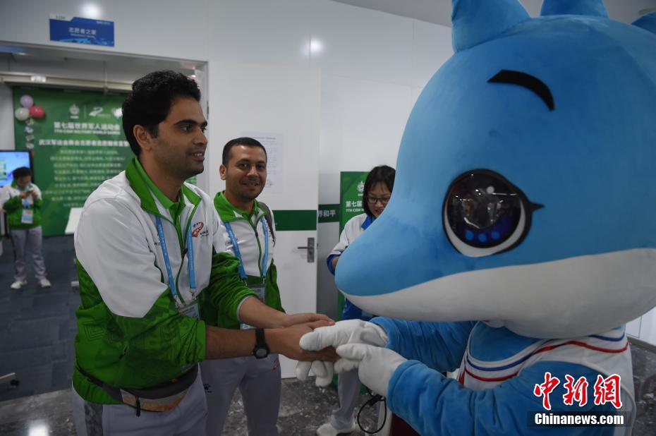 10月24日,幾位在第七屆世界軍人運動會舉辦期間迎來生日的志愿者“小水杉”在主媒體中心內(nèi)的“志愿者之家”過集體生日。圖為來自埃及的志愿者艾爾侯賽因與軍運會吉祥物“兵兵”交流。中新社記者 侯宇 攝