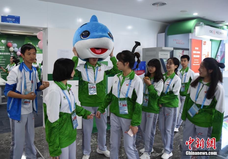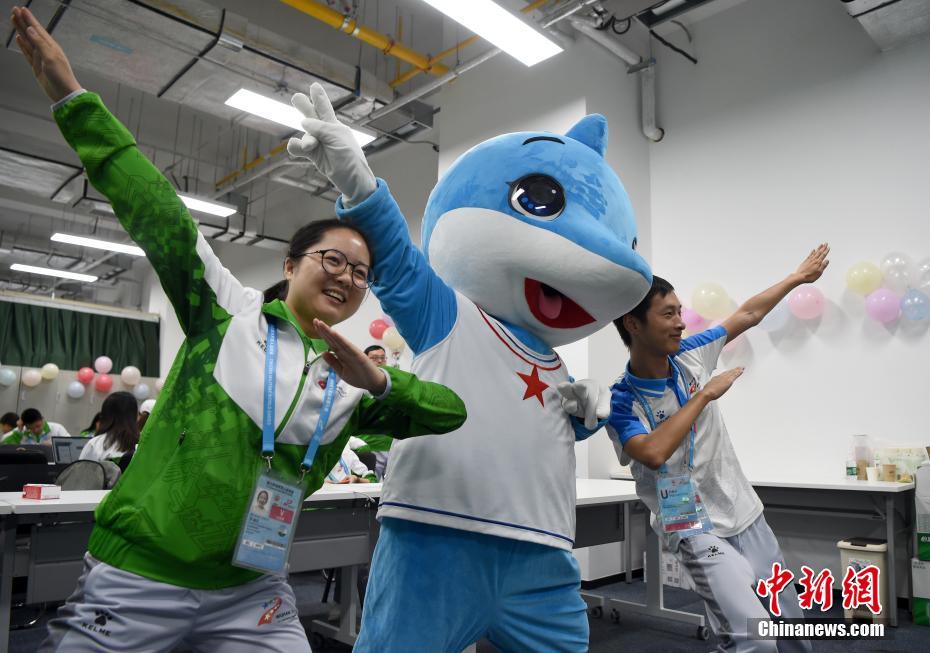 10月24日,幾位在第七屆世界軍人運動會舉辦期間迎來生日的志愿者“小水杉”在主媒體中心內(nèi)的“志愿者之家”過集體生日。圖為軍運會吉祥物“兵兵”向過生日的志愿者們送上小禮物。中新社記者 侯宇 攝