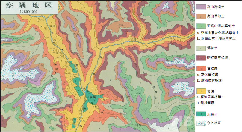 察隅地區(qū)土壤圖 李明森編制并文,引自《青藏高原地圖集》,1990