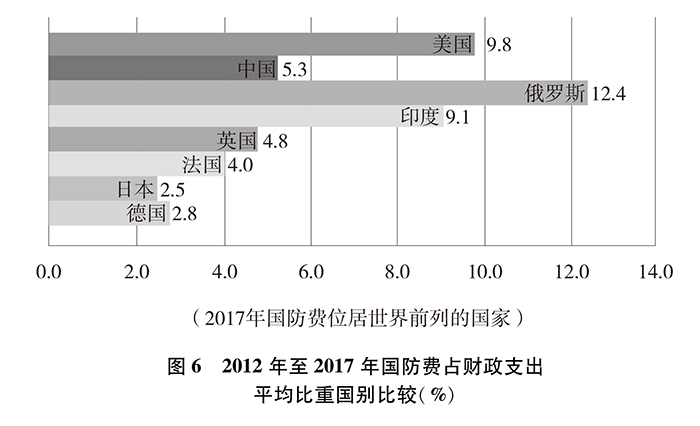 從國(guó)防費(fèi)占財(cái)政支出比重看,2012年至2017年,中國(guó)國(guó)防費(fèi)占財(cái)政支出平均比重約為5.3%,美國(guó)約為9.8%、俄羅斯約為12.4%、印度約為9.1%、英國(guó)約為4.8%、法國(guó)約為4.0%、日本約為2.5%、德國(guó)約為2.8%。中國(guó)國(guó)防費(fèi)占財(cái)政支出的平均比重排在第四位。