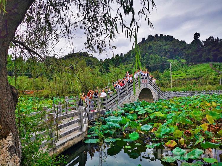 圖為旅游團(tuán)在貴州省湄潭縣龍鳳村田家溝的“幸福橋”合影留念