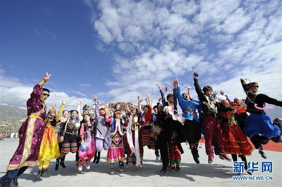 參加“民族情 雪域行”活動的民族團結(jié)形象代表在西藏拉薩布達拉宮廣場合影(2012年9月27日攝)。新華社記者 覺果 攝