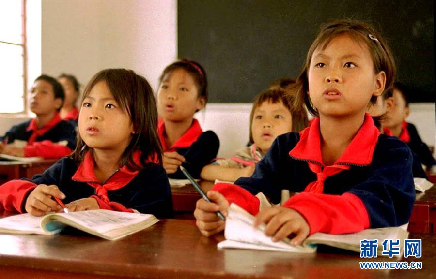 苦聰姐妹張民勒(前右,時年10歲)和張民松(前左,時年8歲)和同學們在云南省者米鄉(xiāng)下納咪小學內(nèi)上課(資料照片)。新華社記者 藺以光 攝