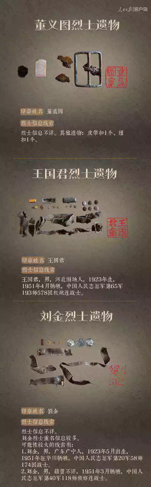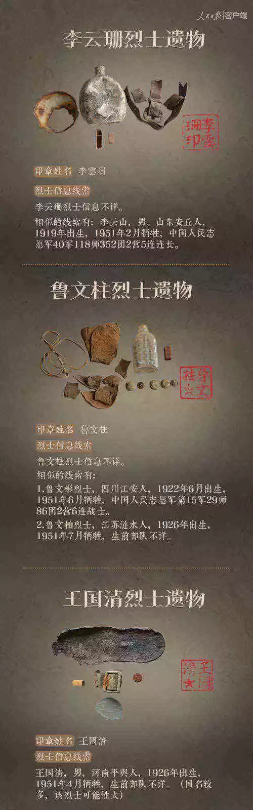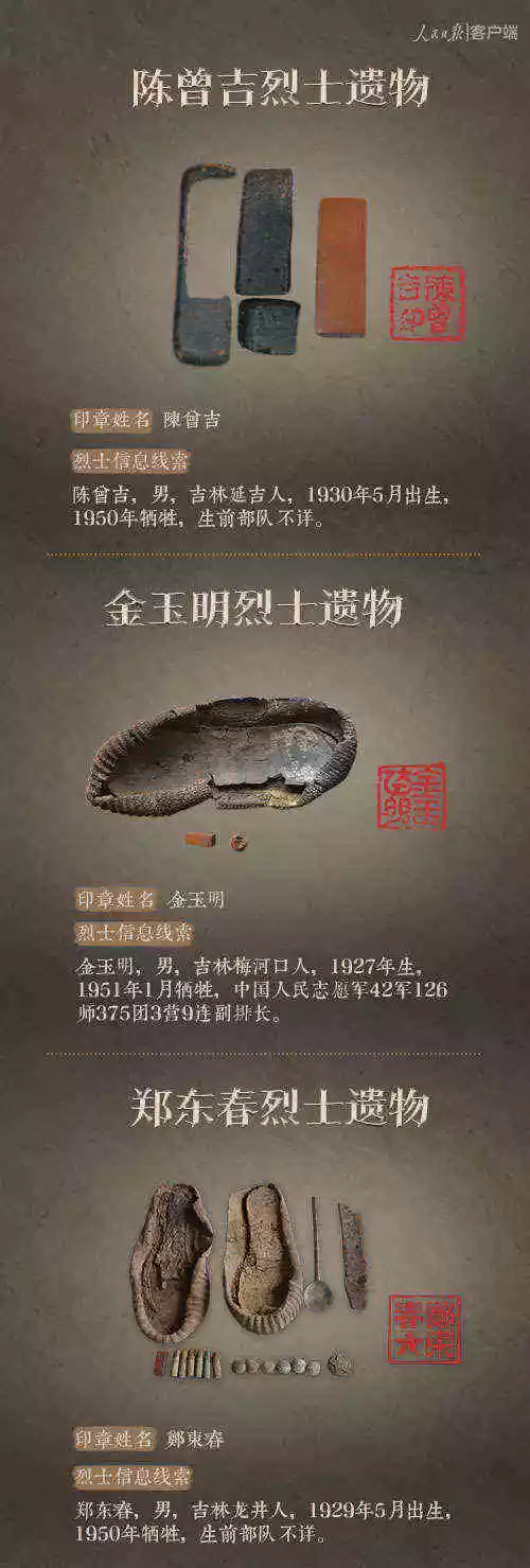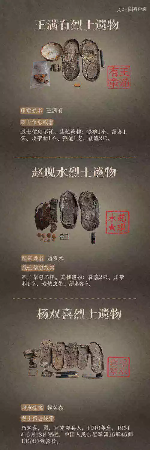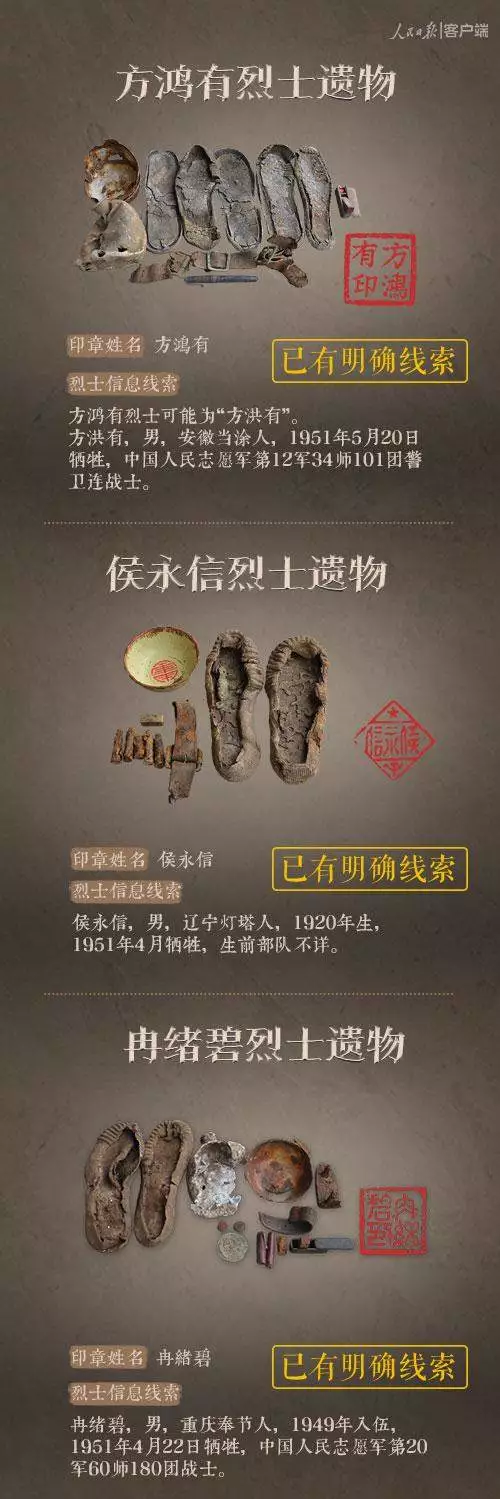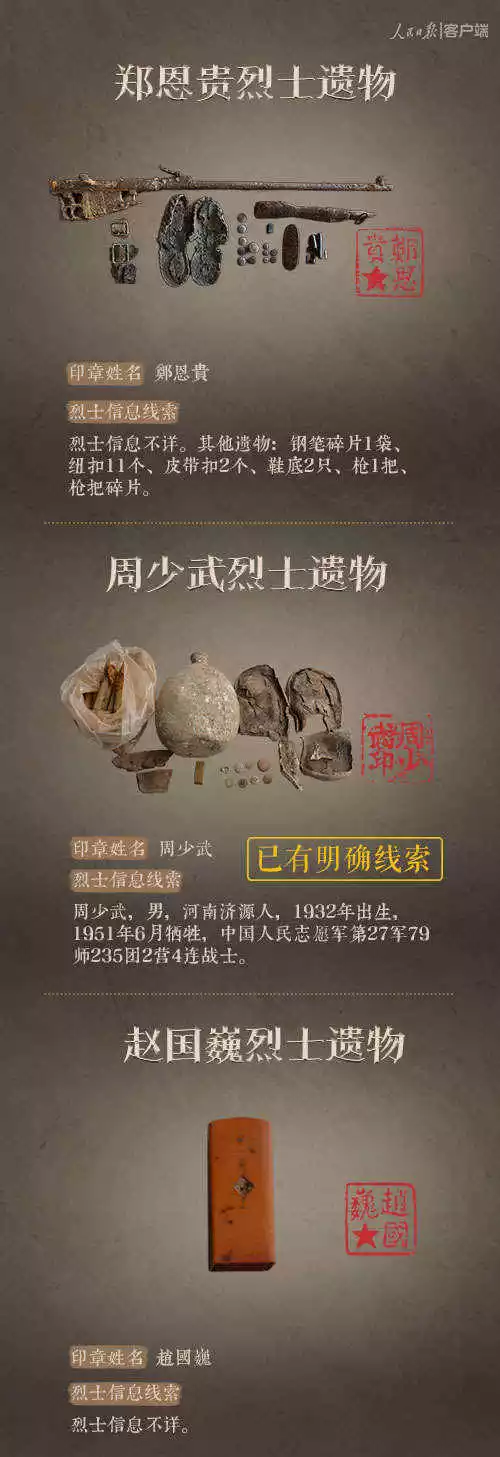 2014年以來,先后有五批589位在韓志愿軍烈士遺骸回到祖國懷抱。退役軍人事務(wù)部從這些烈士的上千件遺物中,發(fā)現(xiàn)了姓名文字圖案清晰可見的24枚印章。近日與人民日報新媒體等共同發(fā)起#尋找英雄#媒體行動,向全社會征集這24位烈士親屬線索。3月29日,人民日報客戶端、法人微博、微信公號同時發(fā)布稿件《當(dāng)年,他們?yōu)槲覀儬奚唤裉欤垶樗麄冏鲆患隆?,向社會介紹“尋找英雄”活動,并公布24位烈士的基本情況和遺物信息。
