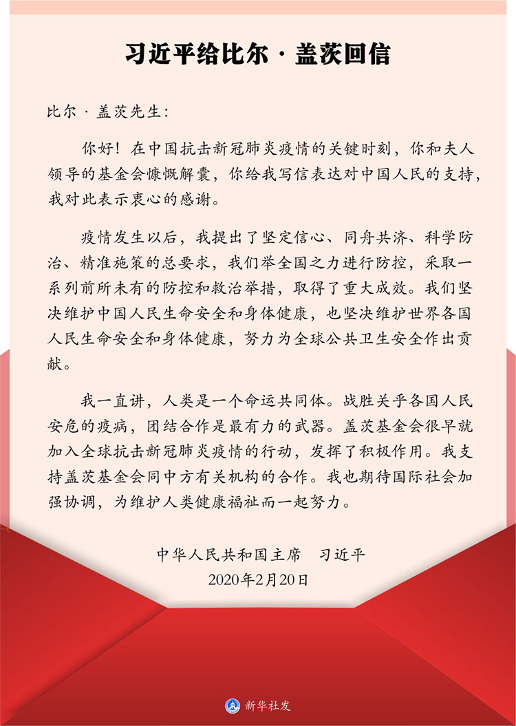 2月20日,在給美國(guó)蓋茨基金會(huì)聯(lián)席主席比爾·蓋茨的回信中,習(xí)近平主席這樣寫道。