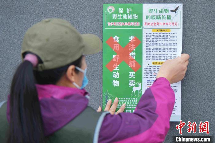 志愿者張貼“禁食野味”的海報?!⊥鹾I 攝