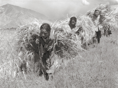 在舊西藏,背負(fù)沉重勞役的農(nóng)奴在為農(nóng)奴主干活。記者 陳振東 鄭少杰 巴桑 整理