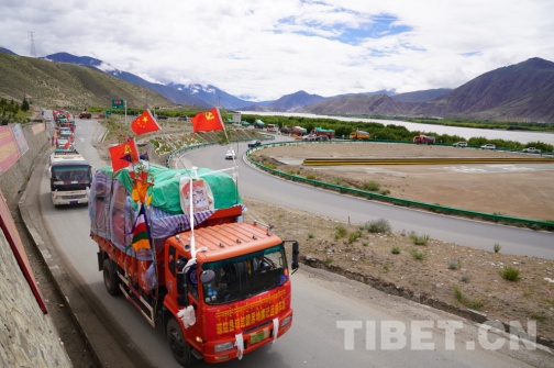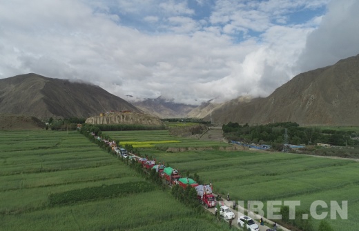 7月10日9時(shí)30分,國(guó)家重點(diǎn)文物保護(hù)單位——松贊干布陵區(qū)前,懸掛著“瓊結(jié)鎮(zhèn)易地搬遷運(yùn)輸車隊(duì)”的39輛車整齊列隊(duì), 20戶78名搬遷戶身著節(jié)日的盛裝,坐著滿載著搬遷群眾幸福和希望的運(yùn)輸車隊(duì)浩浩蕩蕩地從瓊結(jié)縣出發(fā),前往山南市乃東區(qū)多頗章鄉(xiāng)嘎東團(tuán)結(jié)新村搬遷點(diǎn)。
