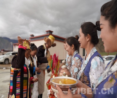 圖為瓊結(jié)鎮(zhèn)扶貧干部自發(fā)組織向搬遷群眾敬獻(xiàn)青稞酒。攝影:曲杰