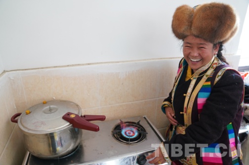 圖為在多頗章鄉(xiāng)嘎東團(tuán)結(jié)新村搬遷點(diǎn),瓊結(jié)鎮(zhèn)雪康社區(qū)搬遷戶索朗玉珍做飯第一次用上了煤氣灶。攝影:曲杰