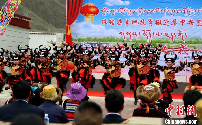 圖為瓊結(jié)縣民間藝術(shù)團(tuán)在易地扶貧搬遷集中安置點(diǎn)入住儀式上表演舞蹈《和諧家園》。倫珠澤仁 攝