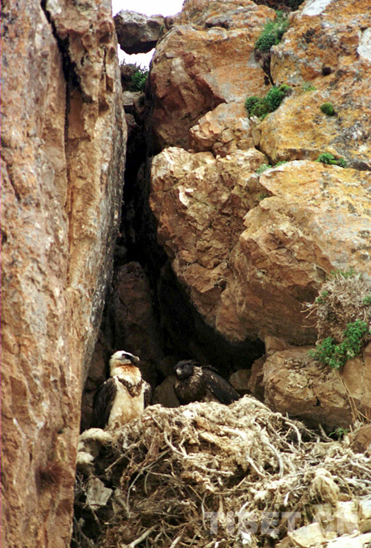 科考人員在科考中發(fā)現(xiàn),在扎西多半島西北角突兀懸崖峭壁上有一個(gè)很大的胡兀鷲雜草屋,只見雌鳥飛出飛進(jìn),在給4個(gè)月大小的雛鳥喂食。這種頭頂和后頸為白色、頭頂周圍有一圈黑羽,長有胡須、腹部為褐色的胡兀鷲,體長1米多。