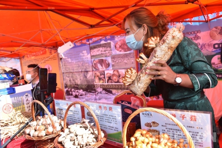 豐收的成果就要“曬”出來(lái)。一邊是精彩紛呈的表演,一邊則是品種豐富的現(xiàn)場(chǎng)展示。在活動(dòng)現(xiàn)場(chǎng),19個(gè)鄉(xiāng)鎮(zhèn)和10多個(gè)龍頭企業(yè)的上百種特色優(yōu)質(zhì)農(nóng)產(chǎn)品搬上各自的展臺(tái),華藏寺鎮(zhèn)的蕨麻豬肉、打柴溝鎮(zhèn)的高原夏菜、炭山嶺鎮(zhèn)的羊羔肉、抓喜秀龍鎮(zhèn)的白牦牛肉、松山鎮(zhèn)的滑子菇、天堂鎮(zhèn)的中藥材、西大灘鎮(zhèn)的百合、大紅溝鎮(zhèn)的藏地雪雞等都是游客們爭(zhēng)相品嘗購(gòu)買的“香餑餑”?!斑@是天祝白牦牛肉干,歡迎大家選購(gòu)品嘗?!背爽F(xiàn)場(chǎng)人頭攢動(dòng),線上直播也是一片熱鬧。在直播帶貨現(xiàn)場(chǎng),20多名網(wǎng)紅在直播中為天祝農(nóng)特產(chǎn)品 “吆喝”,深入挖掘本地原產(chǎn)經(jīng)濟(jì),通過(guò)直播新技術(shù)帶動(dòng)農(nóng)牧民群眾創(chuàng)業(yè)增收。