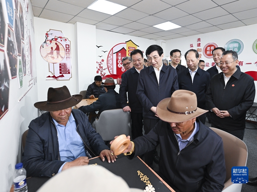 7月25日至27日,中共中央政治局常委、全國政協(xié)主席王滬寧在西藏調(diào)研。這是7月27日,王滬寧在拉薩城關(guān)區(qū)八廓街道魯固社區(qū)民族團(tuán)結(jié)進(jìn)步之家考察。新華社記者 燕雁 攝