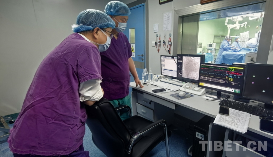 圖為陰赪茜(手術室內右)趕赴阿壩州人民醫(yī)院手術救治急性心?;颊?,通過比對屏幕上的畫面,術后(左側屏幕)患者的心臟血管血流已較術前明顯恢復 攝影:劉莉