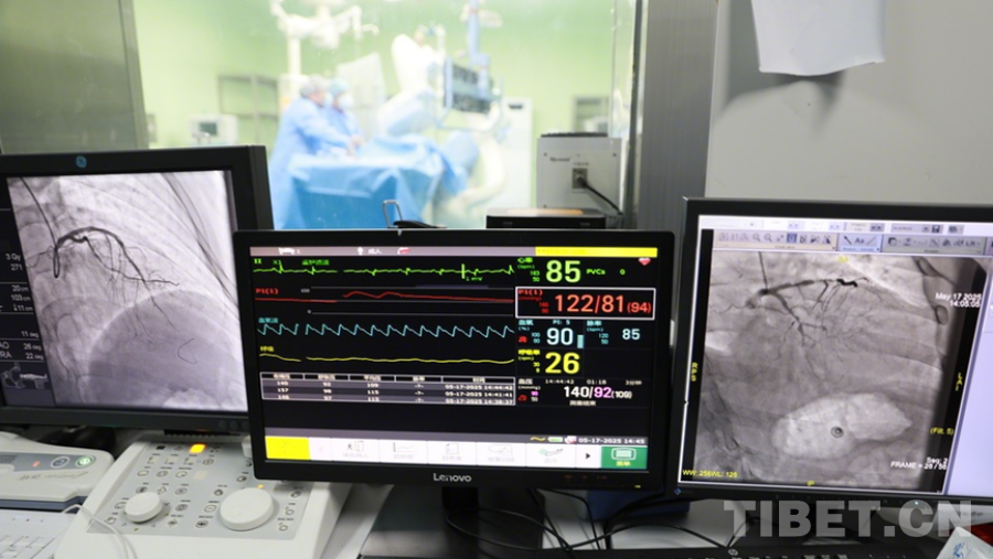 圖為陰赪茜趕赴阿壩州人民醫(yī)院手術救治急性心?;颊?,屏幕上顯示出患者心臟血管多處問題嚴重 攝影:劉莉
