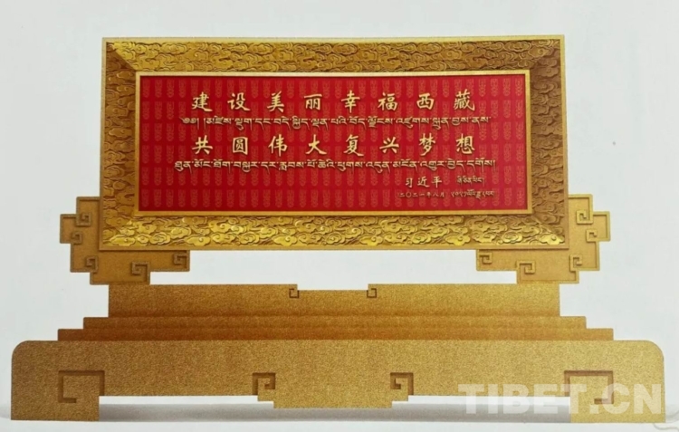 習近平總書記題詞的“建設美麗幸福西藏 共圓偉大復興夢想”賀匾