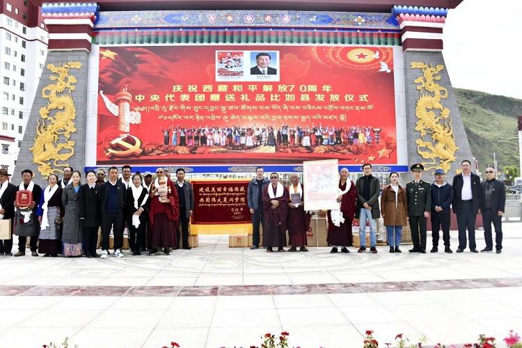中國(guó)西藏網(wǎng)訊 為表達(dá)以習(xí)近平同志為核心的黨中央的親切關(guān)懷和全國(guó)人民的深情厚誼,出席西藏和平解放70周年慶?;顒?dòng)的中央代表團(tuán)向西藏贈(zèng)送多項(xiàng)紀(jì)念品。8月23日下午,西藏自治區(qū)那曲市比如縣隆重舉行中央代表團(tuán)贈(zèng)送禮品發(fā)放儀式。