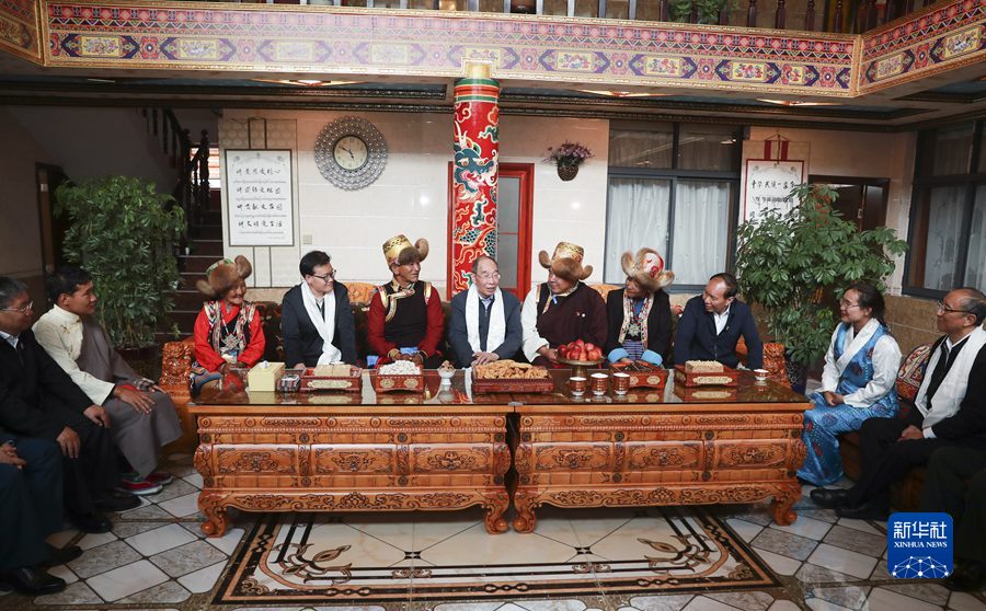 8月20日,中央代表團(tuán)山南、日喀則分團(tuán)帶著以習(xí)近平同志為核心的黨中央的深切關(guān)懷和全國(guó)人民的深情祝福,分別看望慰問當(dāng)?shù)馗髯甯鹘绺刹咳罕?。這是中共中央書記處書記、中央統(tǒng)戰(zhàn)部部長(zhǎng)、中央代表團(tuán)副團(tuán)長(zhǎng)尤權(quán)率山南分團(tuán)在山南市乃東區(qū)昌珠鎮(zhèn)扎西曲登社區(qū)走進(jìn)居民次仁家看望慰問。新華社記者 丁林 攝