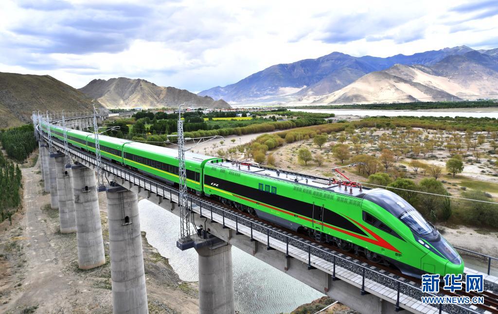 6月25日,全長435公里、設計時速160公里的拉林鐵路建成通車,西藏首條電氣化鐵路建成,同時復興號實現對31個省區(qū)市全覆蓋。這是試運行的復興號列車行駛在西藏山南市境內(6月16日攝)。新華社記者 覺果 攝
