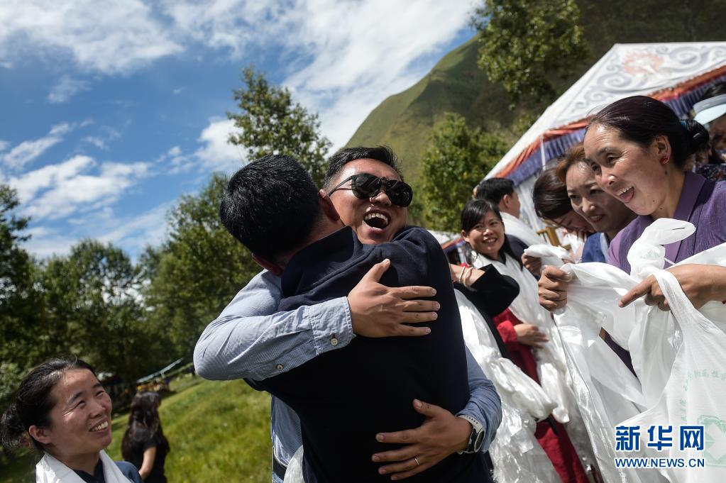 在西藏拉薩市達孜區(qū),北京大學腫瘤醫(yī)院的援藏醫(yī)生袁燦(戴墨鏡者)與送別的藏族同事擁抱(2020年8月1日攝)。新華社記者 彭子洋 攝