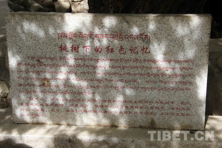 石碑用漢藏雙語刻就,題為“桃樹下的紅色記憶”,正文為“據(jù)考證,當年18軍401團的三營營房指揮部搭建在眼前的大桃樹下,部隊曾經(jīng)在此地了解民情,研究戰(zhàn)事。這棵樹見證了我軍維護地方穩(wěn)定,清剿悍匪的戰(zhàn)斗過程,至今每年3月當?shù)厝罕姸紩园l(fā)前來撫今追昔,表達對先輩們的崇高敬意?!?/p>