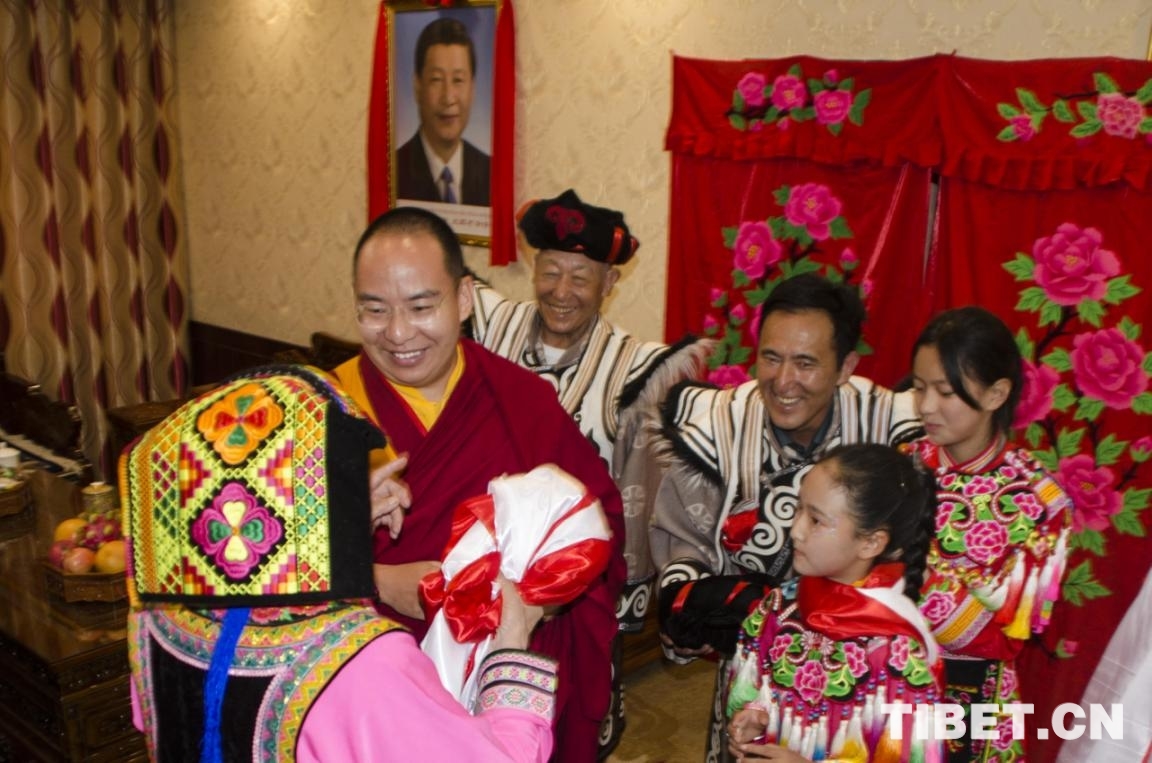 調(diào)研期間,班禪來到松潘縣進(jìn)安鎮(zhèn)居民王永明的家中。班禪在一家人的圍繞中,仔細(xì)詢問家庭收入、生活情況并親切地向他家的小女兒說:“要繼續(xù)努力學(xué)習(xí),將來努力報(bào)效祖國,好不好?”班禪隨后表示,現(xiàn)在的生活越來越好,黨和政府為大家提供了很多機(jī)會(huì),機(jī)遇多、機(jī)會(huì)多。能趕上這么好的一個(gè)偉大時(shí)代,也是我們大家的福報(bào)。