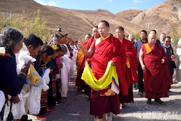 沿途農(nóng)牧區(qū)的信教群眾聞訊前來,身著傳統(tǒng)節(jié)日盛裝、手捧潔白哈達(dá),隊伍綿延數(shù)里,虔誠迎候班禪的到來。每當(dāng)遇到前來迎接的信教群眾,班禪便示意車輛緩行,開窗向信眾揮手致意,氣度不凡又格外親切。