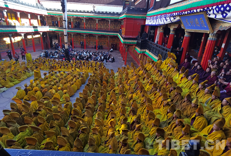 27日(藏歷9月22日),扎什倫布寺舉行祝賀班禪獲得嘎欽學位吉祥祈愿法會。班禪向在場所有僧眾摸頂賜福,并與僧眾集體誦經,回向祈福饒益眾生、法務昌隆、國泰民安、風調雨順。