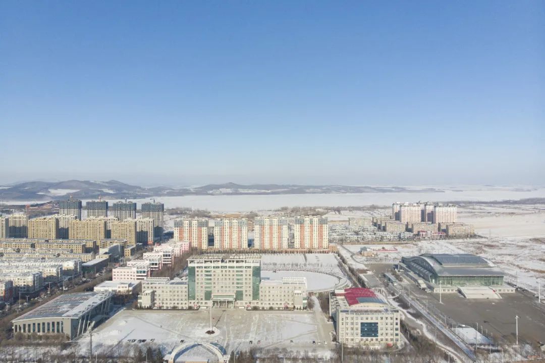 1月12日拍攝的七臺河職業(yè)學院校園和七臺河體育中心(右側建筑)外景(無人機照片)。新華社記者 張濤 攝