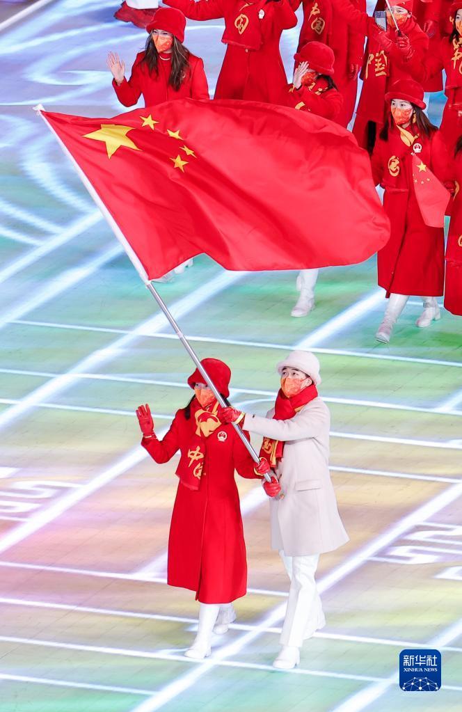 2月4日晚,第二十四屆冬季奧林匹克運動會開幕式在北京國家體育場舉行。這是中國代表團旗手趙丹(下左)、高亭宇(下右)在開幕式上入場。新華社記者 楊磊 攝