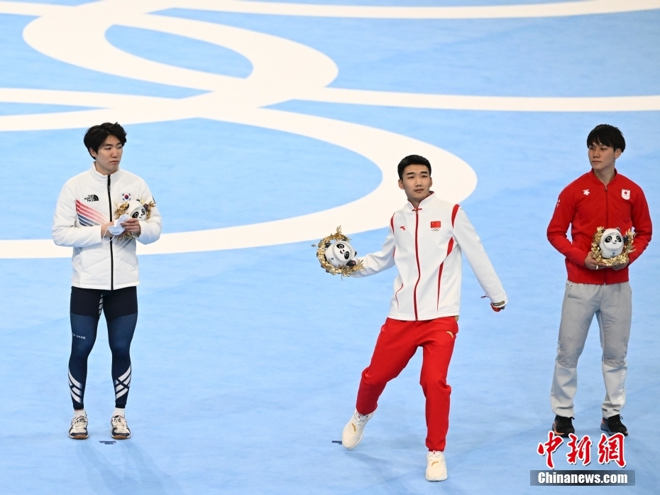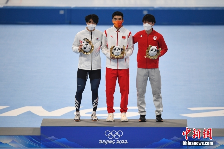 2月12日,北京2022年冬奧會速度滑冰男子500米決賽在國家速滑館“冰絲帶”舉行。中國選手高亭宇以34.32秒的成績打破奧運會紀(jì)錄,奪得冠軍。這是中國首次在冬奧會速度滑冰男子項目獲得金牌。圖為高亭宇(中)在頒發(fā)紀(jì)念品儀式上。 中新社記者 李駿 攝