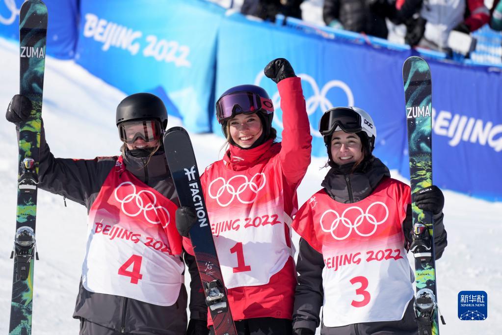 2月18日,獲得冠軍的中國隊選手谷愛凌(中)、獲得亞軍的加拿大選手凱茜·夏普(左)和獲得季軍的加拿大選手蕾切爾·卡克在比賽后慶祝。新華社記者 王昊飛 攝