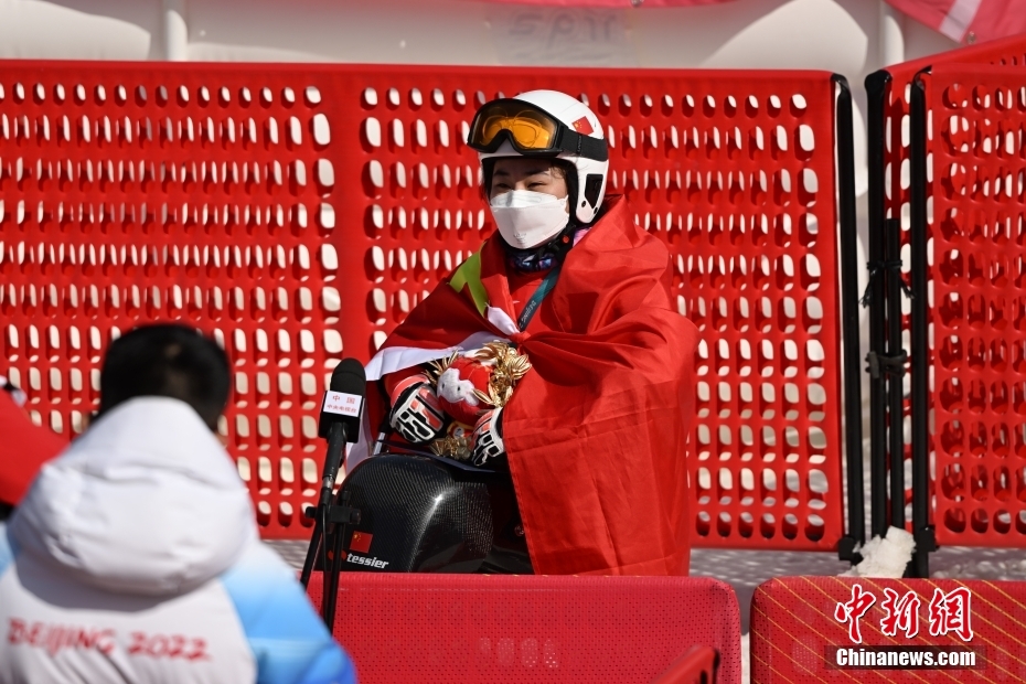 3月6日,中國選手張夢秋賽后慶祝勝利。當(dāng)日,北京2022年冬殘奧會殘奧高山滑雪女子超級大回轉(zhuǎn) - 站姿決賽在延慶國家高山滑雪中心舉行,中國選手張夢秋奪得金牌。 中新社記者 劉冉陽 攝
