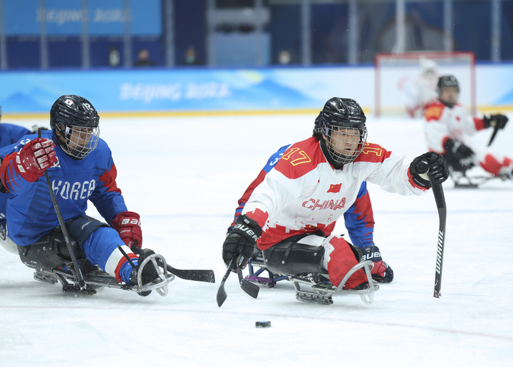 3月12日,中國隊(duì)球員申翼風(fēng)(右)在北京冬殘奧會(huì)冰球銅牌賽中進(jìn)攻。新華社記者蘭紅光攝
