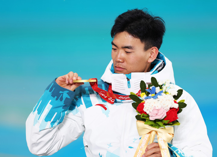 3月6日,冠軍中國選手劉子旭在北京冬殘奧會(huì)冬季兩項(xiàng)男子短距離(坐姿)獎(jiǎng)牌頒發(fā)儀式上。新華社記者賈浩成攝