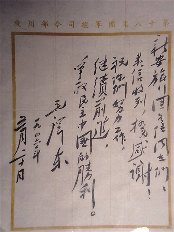 抗戰(zhàn)勝利后,新安旅行團(tuán)給毛主席寫(xiě)信,匯報(bào)工作和學(xué)習(xí)情況,表達(dá)在黨的領(lǐng)導(dǎo)下堅(jiān)持革命斗爭(zhēng)的決心和信心。1946年5月20日,毛主席親筆給“新旅”復(fù)信:“新安旅行團(tuán)全體同志:來(lái)信收到,極為感謝!祝你們努力工作,繼續(xù)前進(jìn),爭(zhēng)取民主中國(guó)的勝利?!比缃?,這封珍貴回信的復(fù)制件就保存在新安旅行團(tuán)歷史紀(jì)念館。