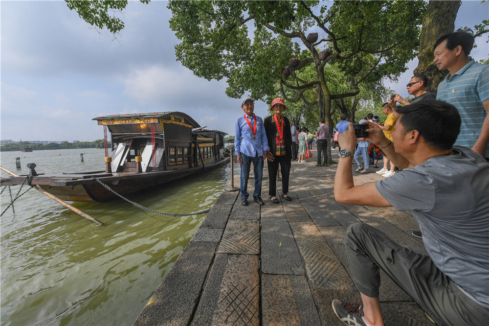 兩名老黨員在浙江嘉興南湖湖心島停泊的南湖紅船旁拍照(7月1日攝)。新華社記者 徐昱 攝