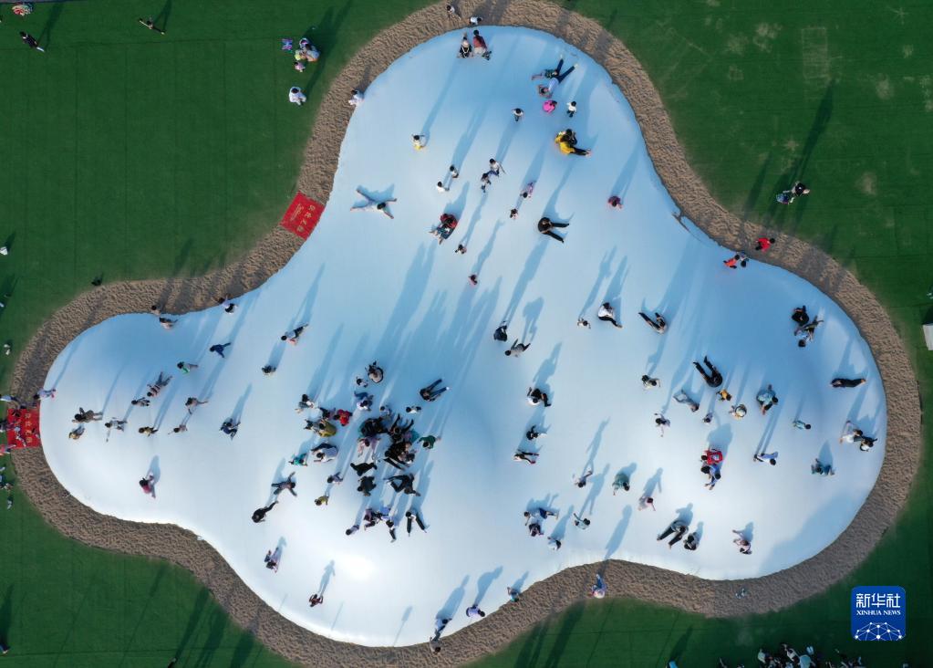 在江西省贛州市章貢區(qū)沙河鎮(zhèn)的羅坑體育特色小鎮(zhèn),游客在體驗戶外蹦床項目(2020年11月15日攝,無人機(jī)照片)。新華社記者 彭昭之 攝